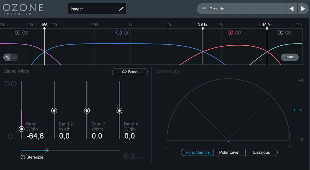 1. Ozone 8 Imager: Csak a basszus tartományban szabályozott, ott a basszus hangokat behúztam vele középre. A sztereókép többi része változatlanul megy tovább. Ennek célja a mono-kompatibilitás javítása, és az ütősebb, egységesebb lábdob-basszus szekció.