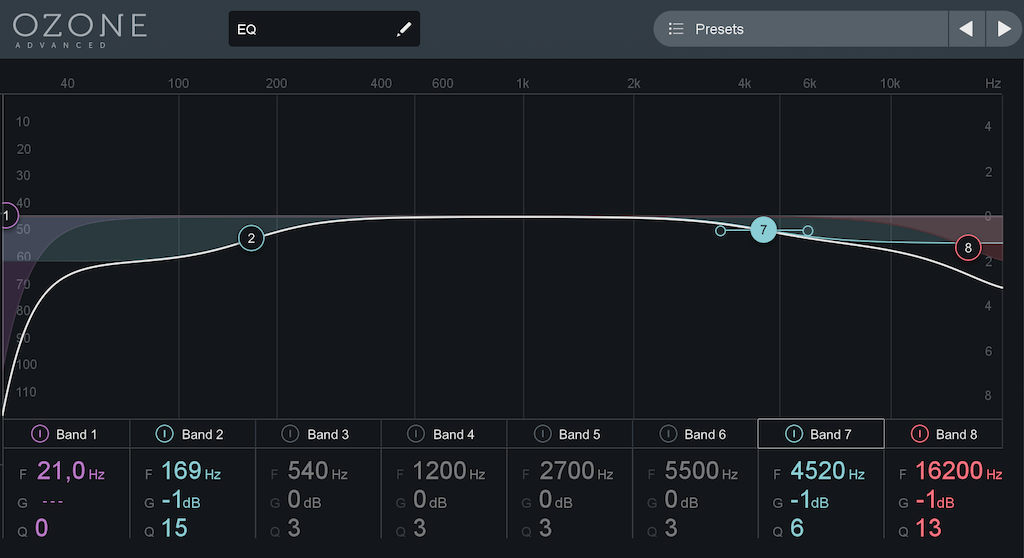 2. Ozone 8 Equalizer: A master EQ a teljes mix összébb rázása, és vintage-ebb hangzása érdekében kicsit lejjebb veszi a mélyeket és a magasakat a kompresszálás előtt. A hangszerek (pl. dob) esetleg már előtte zavaró frekvenciáinak ki-EQ-zása dinamikus EQ-val már a mix-ben megtörtént, így itt csak egy statikus EQ van. A szub-tartománybeli mélyeket is vágtam még itt.