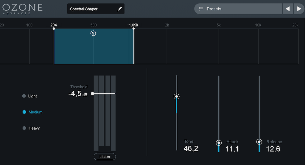 3. Ozone 8 Spectral shaper: A 204 Hz és 1090 Hz közötti mély-mélyközép tartomány volt a leginkább zavaros a keverésnél. A gitár a torzító miatt, a zongora, a basszus itt szól, és az egyes hangszerek szeparálását kicsit segítette ez a Shaper. Nem nagyon tudom megmondani, hogy mit csinál, de valahogy tisztábbnak éreztem tőle ezt a tartományt.