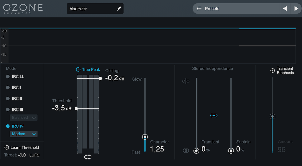 8. Ozone 8 Maximizer: Itt készül a végső master hangerő, dither 16 bit-re, 44.100 kHz, és true peak limiting stream-nél -2 dB-re, CD-nél -0.2 dB-re. A LUFS stream-nél -14, CD-nél -9 (teljes szám vonatkozásában), inkább a hangzásra gyúrva, mint a hangerőre. Mono kompatibilitást is ellenőrzöm, ahol lehet ott a mix-ig visszanyúlva a javítással. Sztereó- és tranziens-hókuszpókusz nincs, nem hallottam jobbnak tőle.