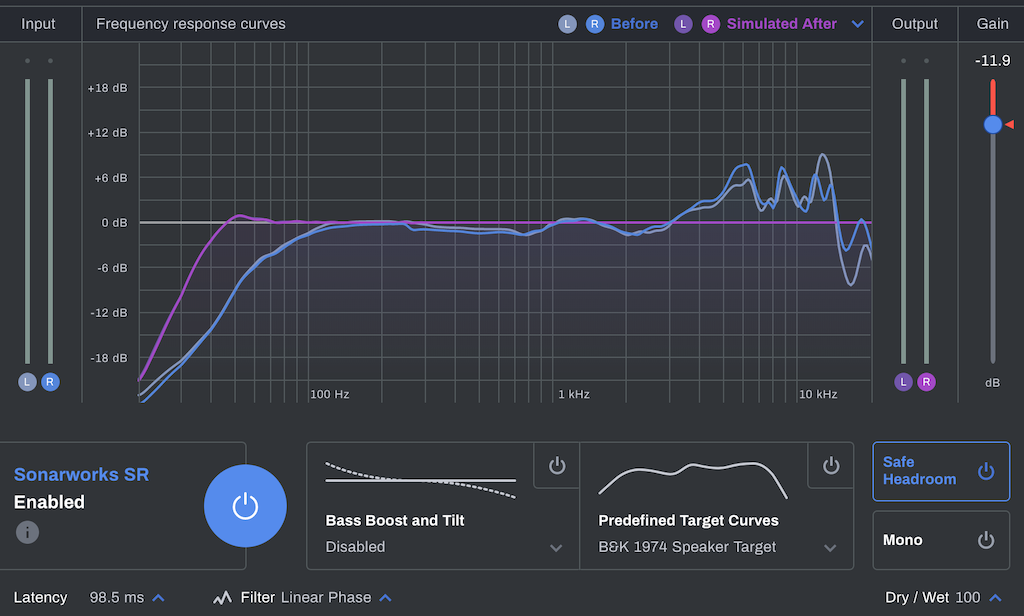 9. Sonarworks Reference: Az AKG K501 bemért füles lineár-kompenzálására, ez a sávok kimentésekor ki van kapcsolva, csak a visszahallgatáskor volt aktív.