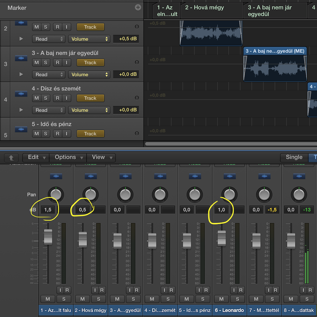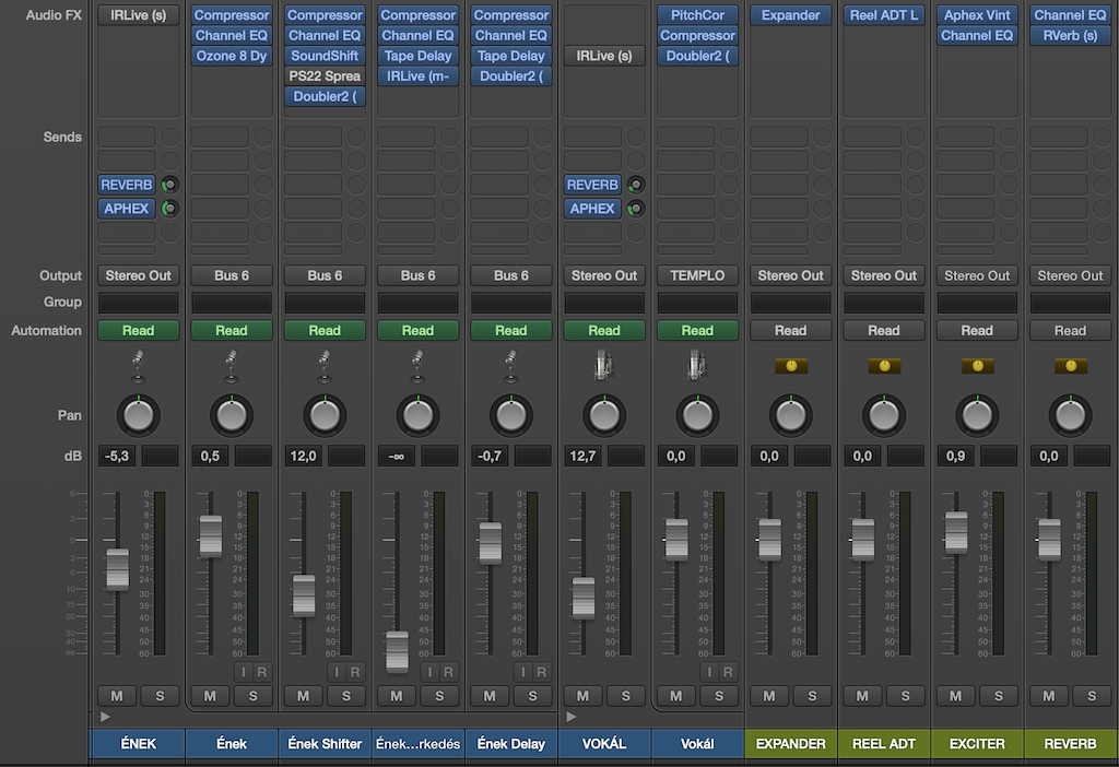 Innentől a keverés már szinte könnyen ment, és mondhatni több időt töltöttem el az egyéb rápakolt szintetikus hangszerek, hangeffektek (malomzúgás, szirénahang, stb.) megszerkesztésével, mint magával a hangzás beállításával. Természetesen kihasználtam a korszerű DAW-ok által kínált lehetőségeket: a motorizált fadereket (magyarul: sok paramétert automatizáltam a hangerőktől a panorámákon keresztül az egyes effektek beállításaig, ha szükséges volt), a könnyen ki-, és bepakolható effekteket és buszokat (az effektek nagy része a beépített effekt, néhány ingyenes, és néhány fizetős is akadt köztük...), és már keveréskor szimuláltam a master szekciót is, még ha ez sokak szerint nem is túl bölcs dolog, de én így szoktam meg.