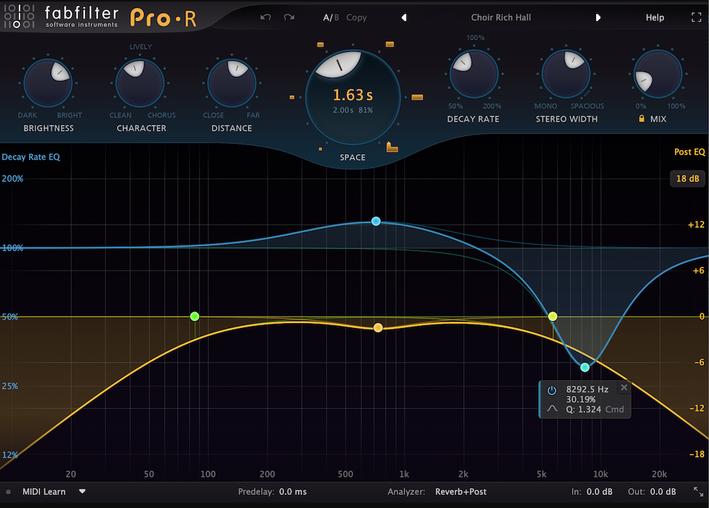 4. FabFilter Pro Reverb: A master reverb-re nem feltétlen lett volna szükség, nélküle is összeállt volna a mix, de ezzel a Hall típusú nagy, terebélyes reverb-bel (minimálisnál kicsit jobban 12-14% hozzáadva) összébb lehetett rázni a dolgokat. Nem sok paramétert állítgattam, inkább csak a preset-ek böngészése közben hagytam azt, amelyik megtetszett. Különlegessége, hogy nem buszon, hanem direktben került hozzáadásra, és a predelay is nulla volt.