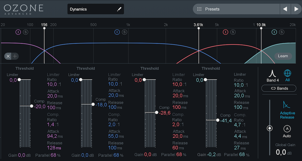 5. Ozone 8 Dynamics: A multiband kompresszor 1-2 dB-t fog meg, inkább csak megerősíti, egységesíti az egyes frekvencia-tartományokat a nagy hangerő emelés előtt. A legfontosabb paraméter itt az attack, amit igyekeztem az alkalmazott hangszerekhez, hangzásokhoz igazítani. Párhuzamos kompresszálás (68% parallel) történik egyébként, tehát az attack mindenhogyan átjön, de a hangok teste kicsit előrébb került.