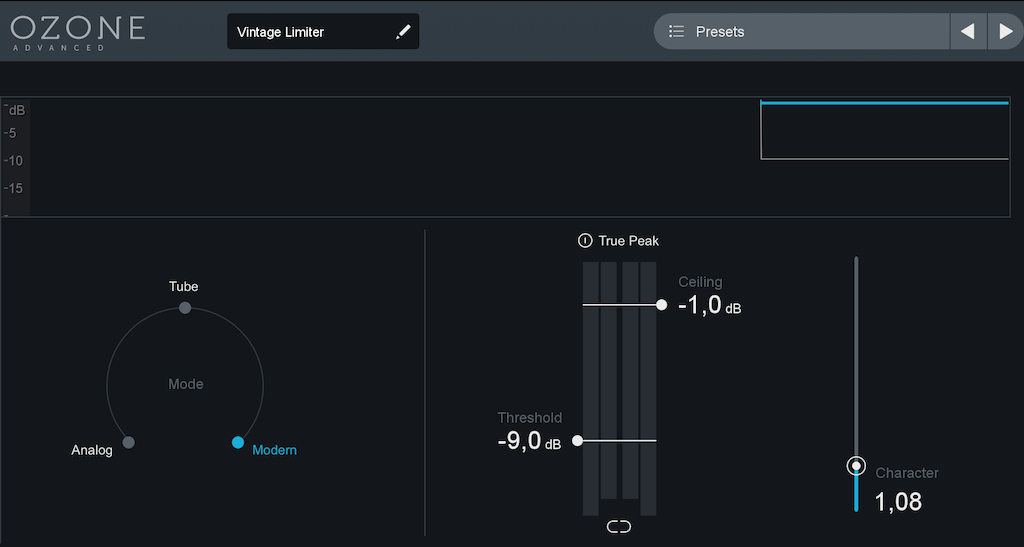 6. Ozone 8 Vintage Limiter: Itt történik a hangerő emelés 1. lépcsője, lényegében a mix hangerőszintjét itt még csak emeljük, nincs kompresszálás, csak a kompresszálás határáig való emelés. Ami nagyon túlmenne, azt limitálom.