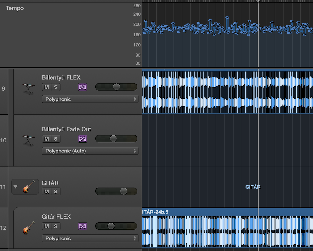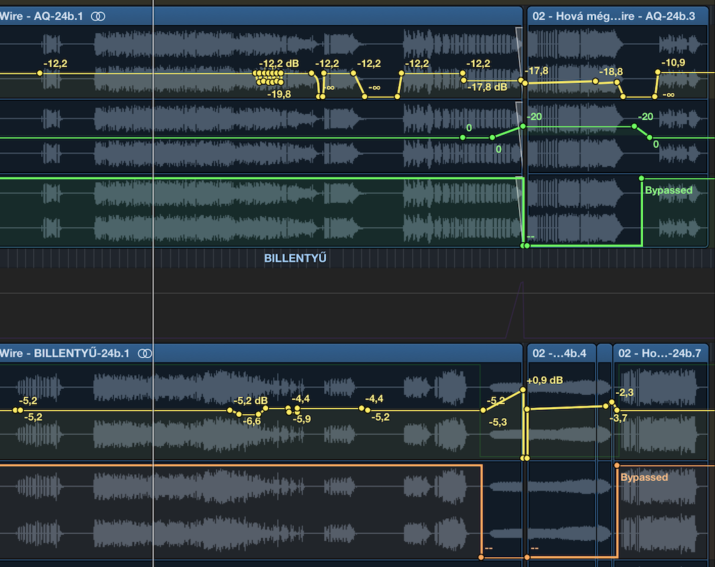 Billentyű: A Pro2 hangja alapvetően nagyon jó, de a felvételkor választott hangszíneket nem minden helyen találtuk el jól, és természetesen MIDI-t nem vettünk fel, csak audiót. Ezért aztán a billentyűt sokféleképp kellett keverni: előrébb hozni, eltakarni részeket, vagy komplett kivágni a kukába (ez minden hangszernél előfordult amúgy :D). Itt a sok hangszín miatt sokféle EQ kellett, de speciális effektekből sem volt hiány, pl. a Megmérettettél-ben 3:30 körül a zongora szuboktávra rákevert szétkompresszált torzítása elég bonyolult, de hatásos kis rész lett.